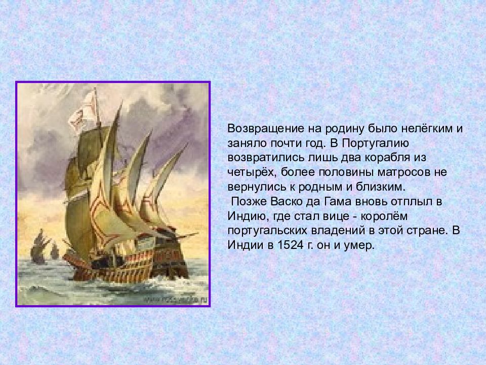 Возвращение на родину было нелёгким и заняло почти год. В Португалию возвратились лишь два корабля из четырёх, более половины матросов не вернулись к родным и близким. Позже Васко да Гама вновь отплыл в Индию, где стал вице - королём португальских владений в этой стране. В Индии в 1524 г. он и умер.