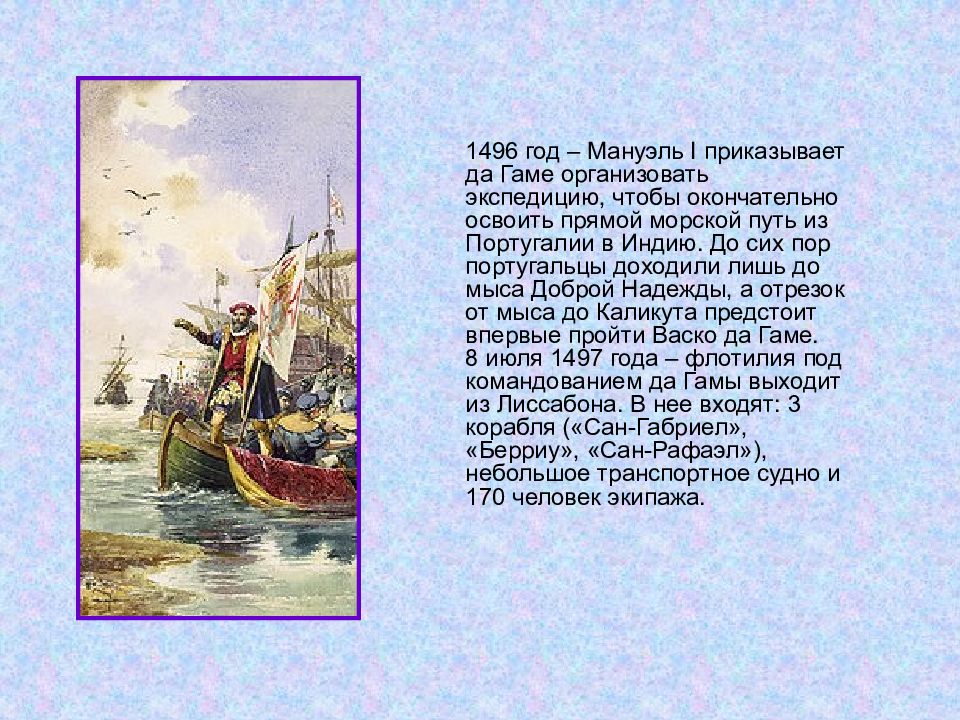 1496 год – Мануэль I приказывает да Гаме организовать экспедицию, чтобы окончательно освоить прямой морской путь из Португалии в Индию. До сих пор португальцы доходили лишь до мыса Доброй Надежды, а отрезок от мыса до Каликута предстоит впервые пройти Васко да Гаме. 8 июля 1497 года – флотилия под командованием да Гамы выходит из Лиссабона. В нее входят: 3 корабля («Сан-Габриел», «Берриу», «Сан-Рафаэл»), небольшое транспортное судно и 170 человек экипажа.
