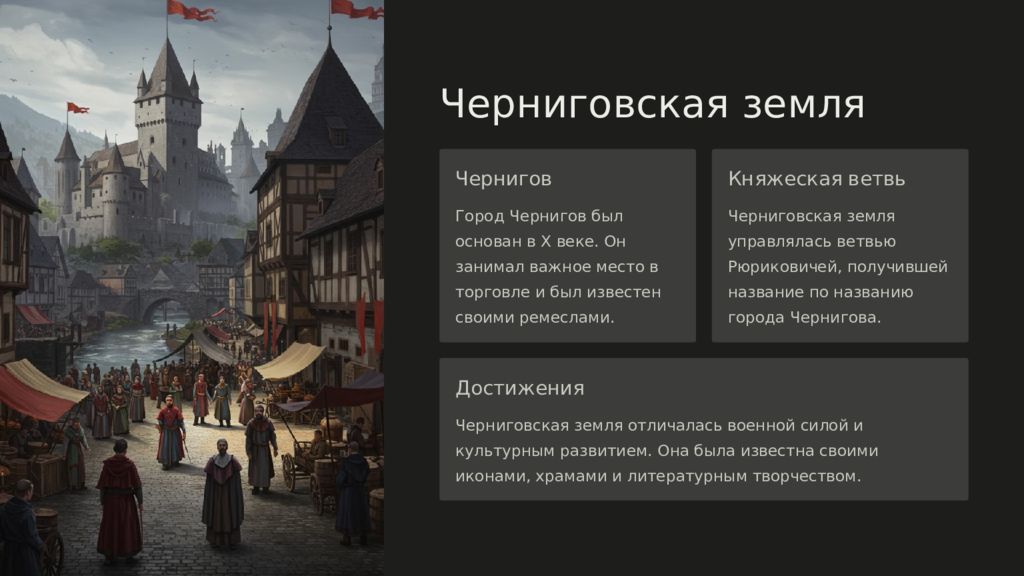 Черниговская земля Чернигов Город Чернигов был основан в X веке. Он занимал важное место в торговле и был известен своими ремеслами. Княжеская ветвь Черниговская земля управлялась ветвью Рюриковичей, получившей название по названию города Чернигова. Достижения Черниговская земля отличалась военной силой и культурным развитием. Она была известна своими иконами, храмами и литературным творчеством.