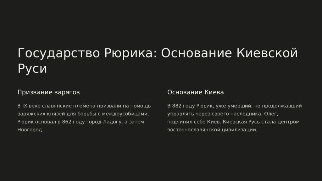 Государство Рюрика: Основание Киевской Руси Призвание варягов В IX веке славянские племена призвали на помощь варяжских князей для борьбы с междоусобицами. Рюрик основал в 862 году город Ладогу, а затем Новгород. Основание Киева В 882 году Рюрик, уже умерший, но продолжавший управлять через своего наследника, Олег, подчинил себе Киев. Киевская Русь стала центром восточнославянской цивилизации.
