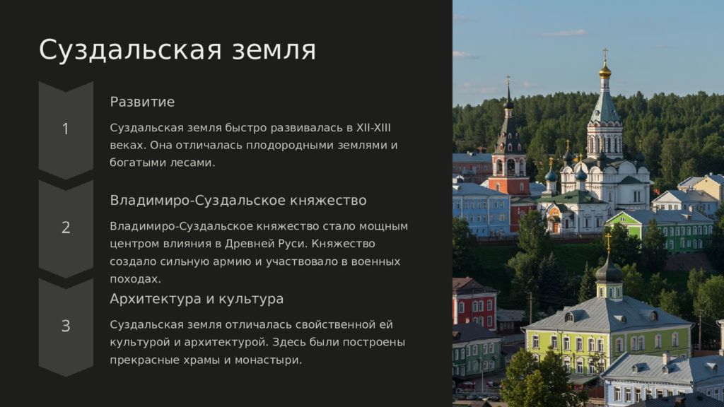 Суздальская земля Развитие Суздальская земля быстро развивалась в XII-XIII веках. Она отличалась плодородными землями и богатыми лесами. Владимиро-Суздальское княжество Владимиро-Суздальское княжество стало мощным центром влияния в Древней Руси. Княжество создало сильную армию и участвовало в военных походах. Архитектура и культура Суздальская земля отличалась свойственной ей культурой и архитектурой. Здесь были построены прекрасные храмы и монастыри.