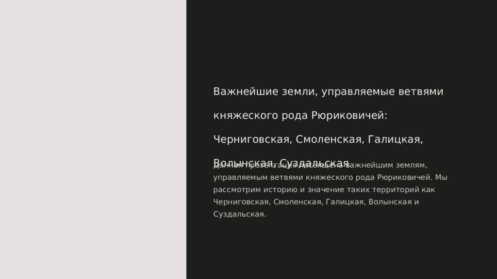 Важнейшие земли, управляемые ветвями княжеского рода Рюриковичей: Черниговская, Смоленская, Галицкая, Волынская, Суздальская Данная презентация посвящена важнейшим землям, управляемым ветвями княжеского рода Рюриковичей. Мы рассмотрим историю и значение таких территорий как Черниговская, Смоленская, Галицкая, Волынская и Суздальская.