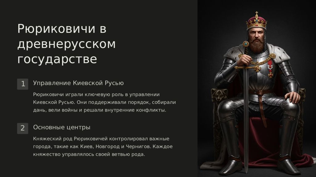 Рюриковичи в древнерусском государстве 1 Управление Киевской Русью Рюриковичи играли ключевую роль в управлении Киевской Русью. Они поддерживали порядок, собирали дань, вели войны и решали внутренние конфликты. 2 Основные центры Княжеский род Рюриковичей контролировал важные города, такие как Киев, Новгород и Чернигов. Каждое княжество управлялось своей ветвью рода.