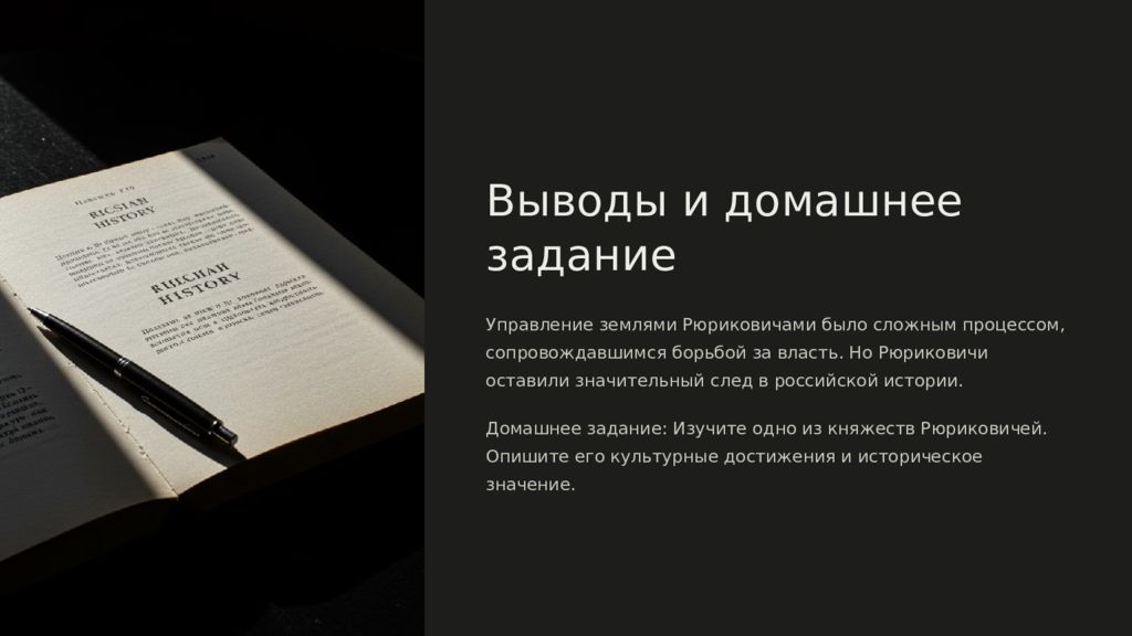 Выводы и домашнее задание Управление землями Рюриковичами было сложным процессом, сопровождавшимся борьбой за власть. Но Рюриковичи оставили значительный след в российской истории. Домашнее задание: Изучите одно из княжеств Рюриковичей. Опишите его культурные достижения и историческое значение.