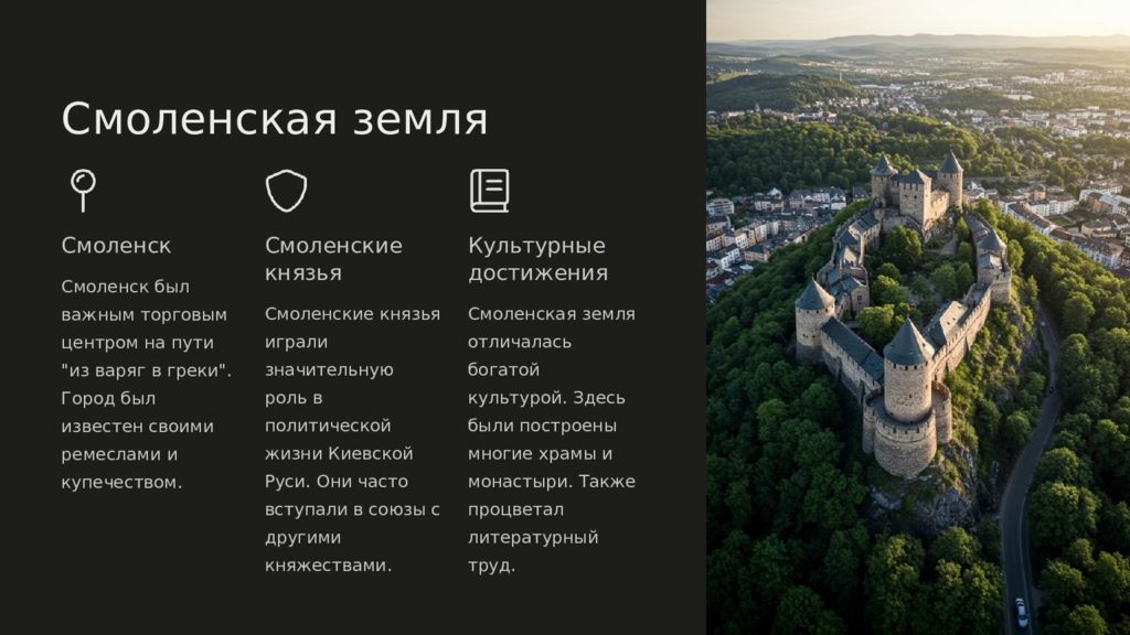 Смоленская земля Смоленск Смоленск был важным торговым центром на пути "из варяг в греки". Город был известен своими ремеслами и купечеством. Смоленские князья Смоленские князья играли значительную роль в политической жизни Киевской Руси. Они часто вступали в союзы с другими княжествами. Культурные достижения Смоленская земля отличалась богатой культурой. Здесь были построены многие храмы и монастыри. Также процветал литературный труд.
