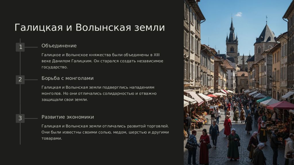 Галицкая и Волынская земли 1 Объединение Галицкое и Волынское княжества были объединены в XIII веке Данилом Галицким. Он старался создать независимое государство. 2 Борьба с монголами Галицкая и Волынская земли подверглись нападениям монголов. Но они отличались солидарностью и отважно защищали свои земли. 3 Развитие экономики Галицкая и Волынская земли отличались развитой торговлей. Они были известны своими солью, медом, шерстью и другими товарами.