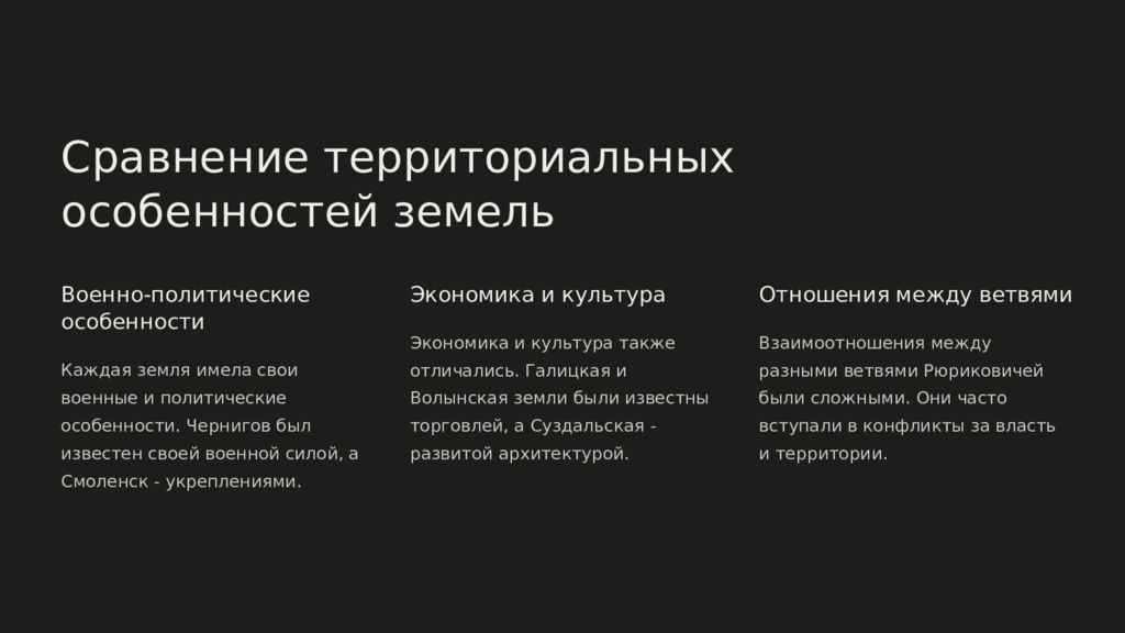 Сравнение территориальных особенностей земель Военно-политические особенности Каждая земля имела свои военные и политические особенности. Чернигов был известен своей военной силой, а Смоленск - укреплениями. Экономика и культура Экономика и культура также отличались. Галицкая и Волынская земли были известны торговлей, а Суздальская - развитой архитектурой. Отношения между ветвями Взаимоотношения между разными ветвями Рюриковичей были сложными. Они часто вступали в конфликты за власть и территории.