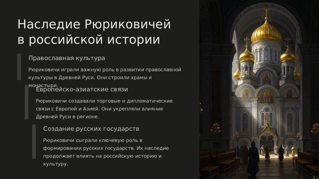 Наследие Рюриковичей в российской истории Православная культура Рюриковичи играли важную роль в развитии православной культуры в Древней Руси. Они строили храмы и монастыри. Европейско-азиатские связи Рюриковичи создавали торговые и дипломатические связи с Европой и Азией. Они укрепляли влияние Древней Руси в регионе. Создание русских государств Рюриковичи сыграли ключевую роль в формировании русских государств. Их наследие продолжает влиять на российскую историю и культуру.