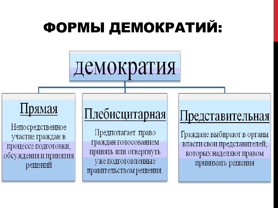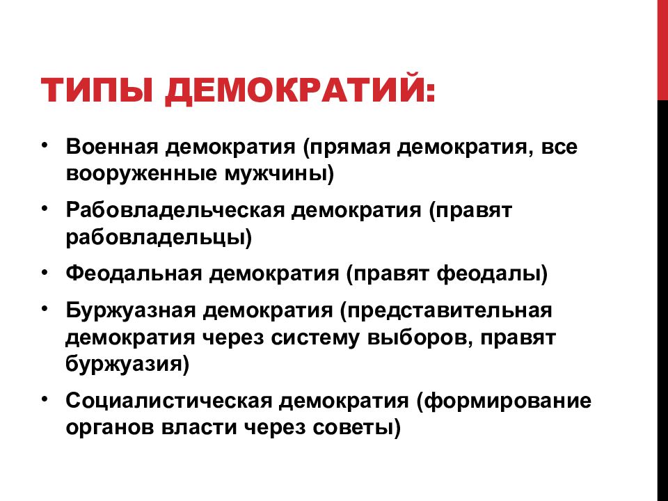 Военная демократия (прямая демократия, все вооруженные мужчины) Рабовладельческая демократия (правят рабовладельцы) Феодальная демократия (правят феодалы) Буржуазная демократия (представительная демократия через систему выборов, правят буржуазия) Социалистическая демократия (формирование органов власти через советы)