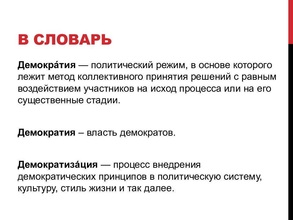 Демокра́тия — политический режим, в основе которого лежит метод коллективного принятия решений с равным воздействием участников на исход процесса или на его существенные стадии. Демократия – власть демократов. Демократиза́ция — процесс внедрения демократических принципов в политическую систему, культуру, стиль жизни и так далее.