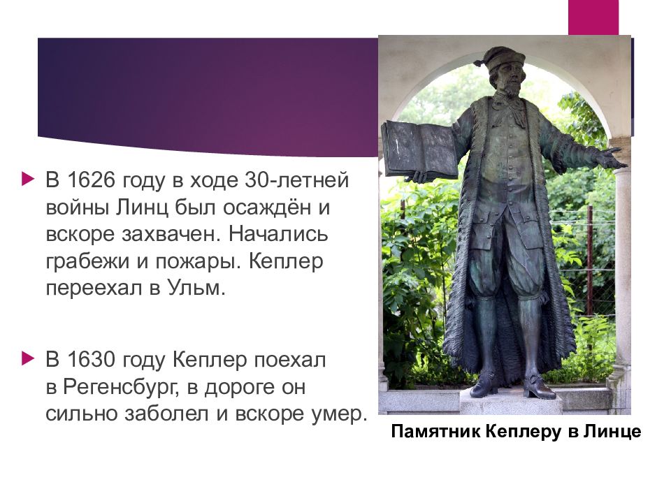 В 1626 году в ходе 30-летней войны Линц был осаждён и вскоре захвачен. Начались грабежи и пожары. Кеплер переехал в Ульм. В 1630 году Кеплер поехал в Регенсбург, в дороге он сильно заболел и вскоре умер. Памятник Кеплеру в Линце