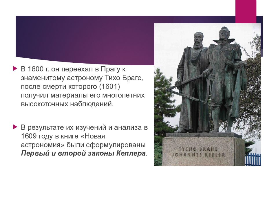 В 1600 г. он переехал в Прагу к знаменитому астроному Тихо Браге, после смерти которого (1601) получил материалы его многолетних высокоточных наблюдений. В результате их изучений и анализа в 1609 году в книге «Новая астрономия» были сформулированы Первый и второй законы Кеплера.