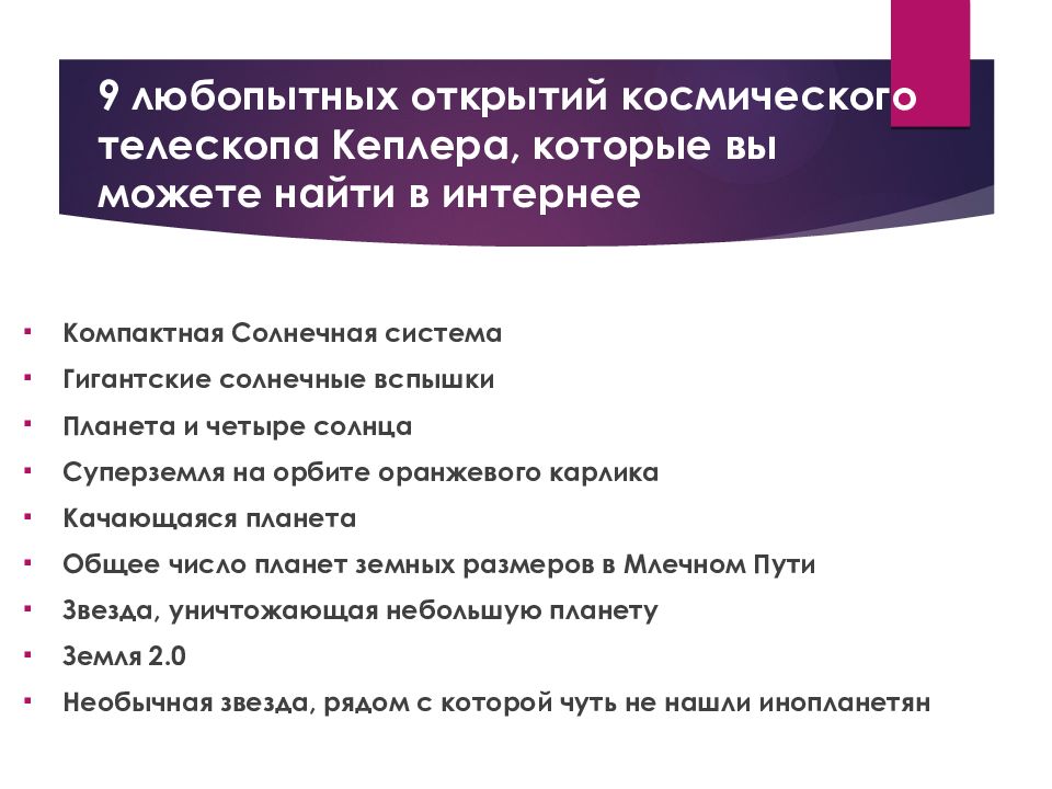 Компактная Солнечная система Гигантские солнечные вспышки Планета и четыре солнца Суперземля на орбите оранжевого карлика Качающаяся планета Общее число планет земных размеров в Млечном Пути Звезда, уничтожающая небольшую планету Земля 2.0 Необычная звезда, рядом с которой чуть не нашли инопланетян 9 любопытных открытий космического телескопа Кеплера, которые вы можете найти в интернее