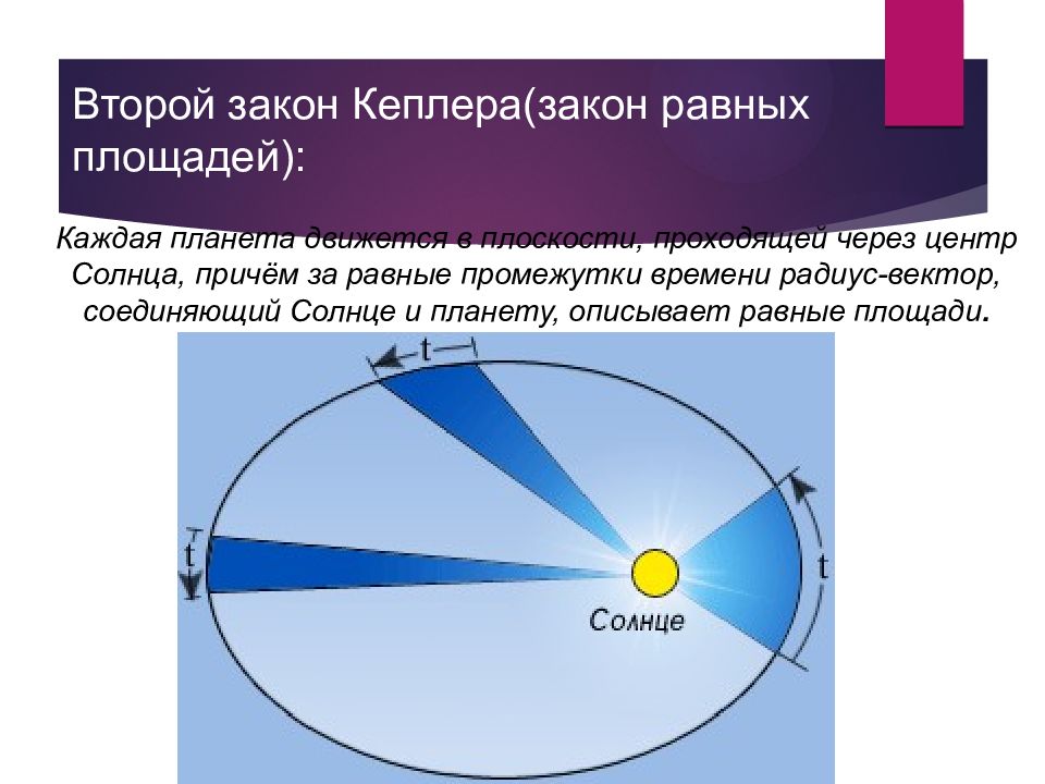 Каждая планета движется в плоскости, проходящей через центр Солнца, причём за равные промежутки времени радиус-вектор, соединяющий Солнце и планету, описывает равные площади.