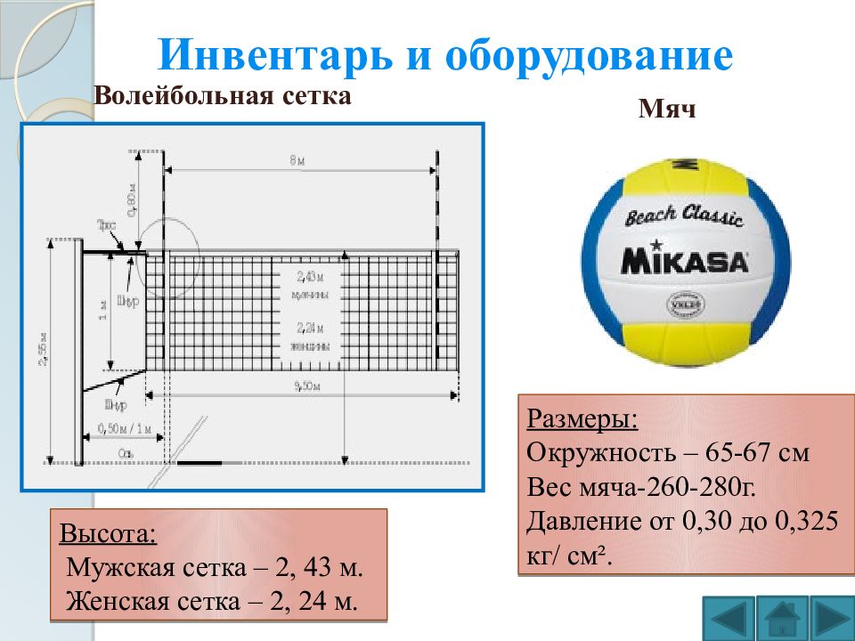 Инвентарь и оборудование Размеры: Окружность – 65-67 см Вес мяча-260-280г. Давление от 0,30 до 0,325 кг / см ². Высота: Мужская сетка – 2, 43 м. Женская сетка – 2, 24 м. Волейбольная сетка Мяч