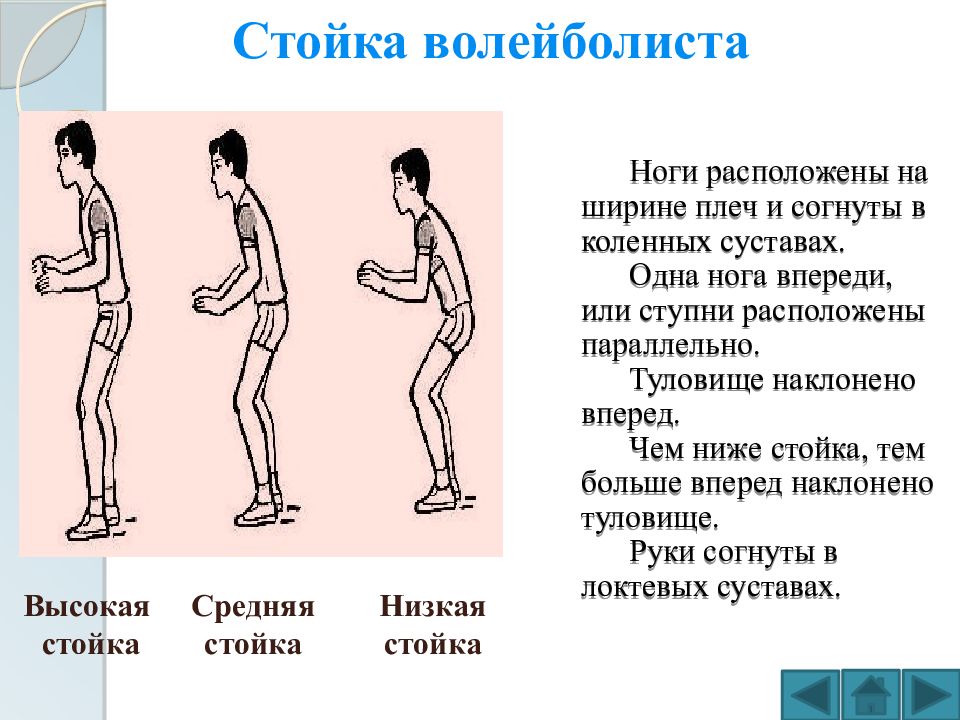 Ноги расположены на ширине плеч и согнуты в коленных суставах. Одна нога впереди, или ступни расположены параллельно. Туловище наклонено вперед. Чем ниже стойка, тем больше вперед наклонено туловище. Руки согнуты в локтевых суставах. Высокая стойка Средняя стойка Низкая стойка Стойка волейболиста