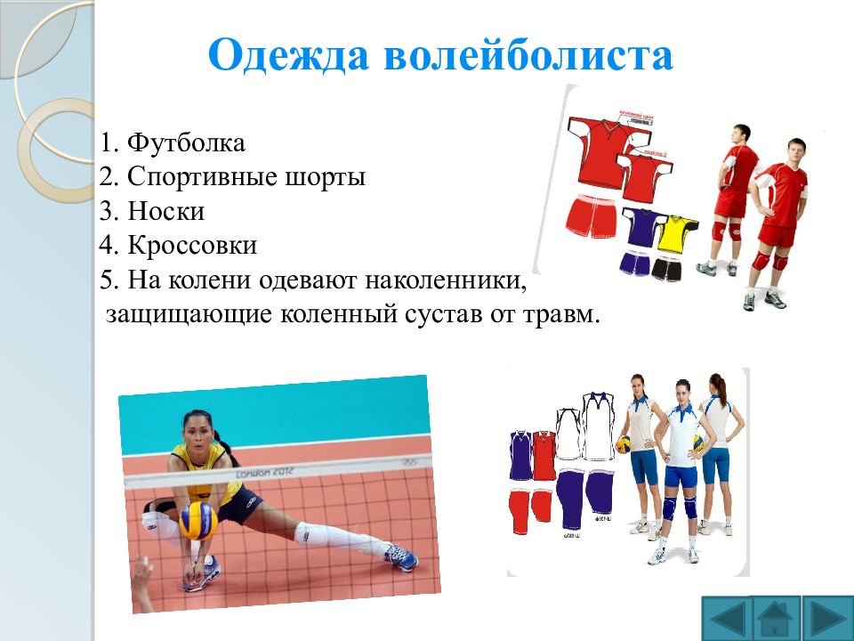 1. Футболка 2. Спортивные шорты 3. Носки 4. Кроссовки 5. На колени одевают наколенники, защищающие коленный сустав от травм. Одежда волейболиста