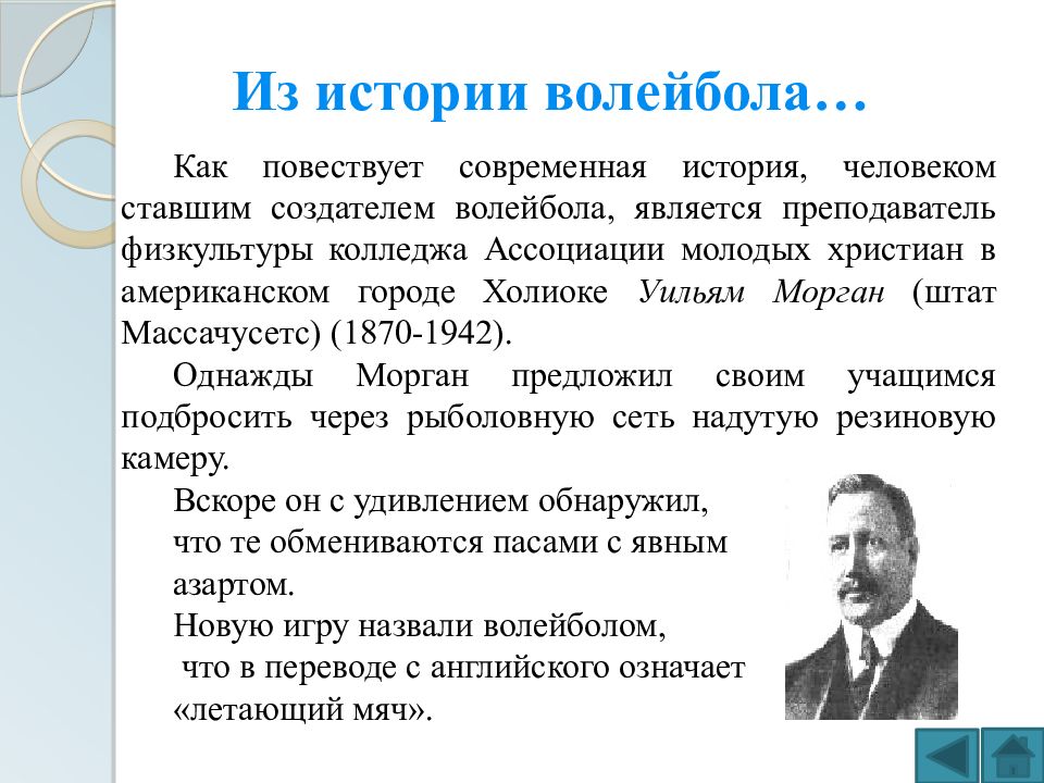 Как повествует современная история, человеком ставшим создателем волейбола, является преподаватель физкультуры колледжа Ассоциации молодых христиан в американском городе Холиоке Уильям Морган (штат Массачусетс) (1870-1942). Однажды Морган предложил своим учащимся подбросить через рыболовную сеть надутую резиновую камеру. Вскоре он с удивлением обнаружил, что те обмениваются пасами с явным азартом. Новую игру назвали волейболом, что в переводе с английского означает «летающий мяч». Из истории волейбола…