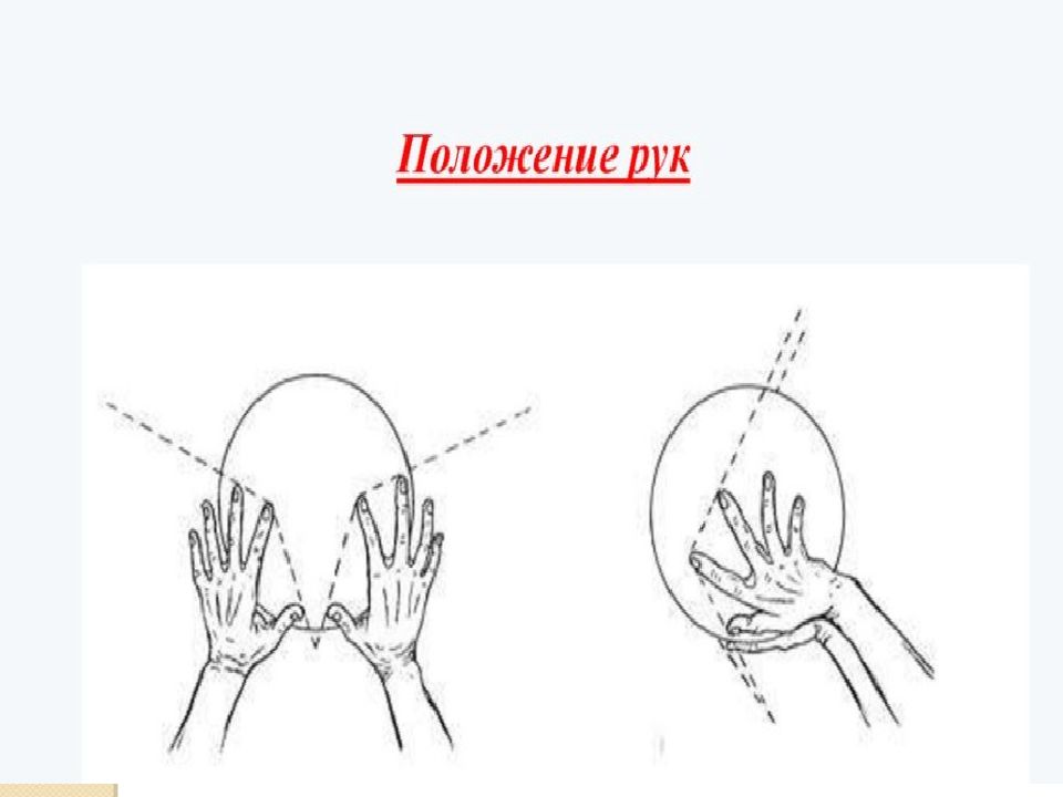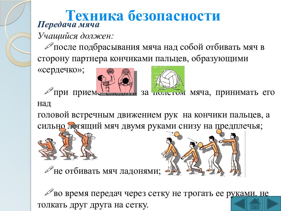 Техника безопасности Передача мяча Учащийся должен: после подбрасывания мяча над собой отбивать мяч в сторону партнера кончиками пальцев, образующими «сердечко»; при приеме следить за полетом мяча, принимать его над головой встречным движением рук на кончики пальцев, а сильно летящий мяч двумя руками снизу на предплечья; не отбивать мяч ладонями; во время передач через сетку не трогать ее руками, не толкать друг друга на сетку.