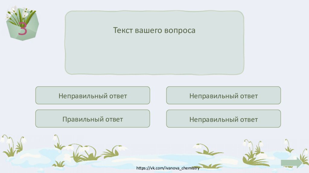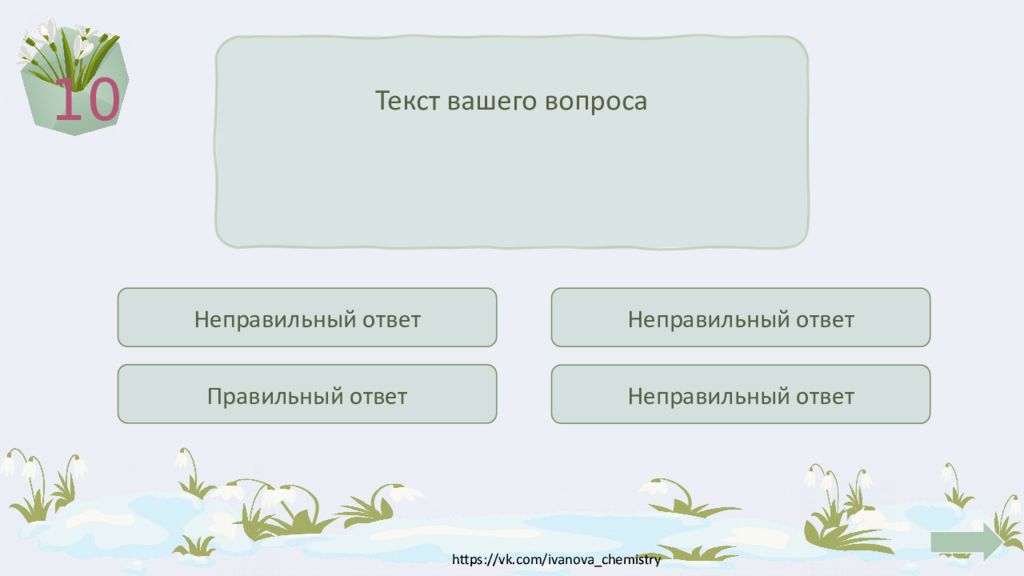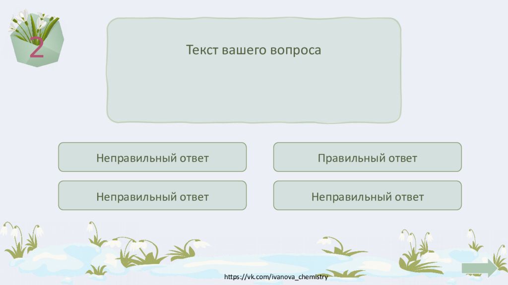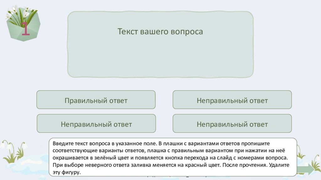 1 Текст вашего вопроса Правильный ответ Неправильный ответ Неправильный ответ Неправильный ответ Введите текст вопроса в указанное поле. В плашки с вариантами ответов пропишите соответствующие варианты ответов, плашка с правильным вариантом при нажатии на неё окрашивается в зелёный цвет и появляется кнопка перехода на слайд с номерами вопроса. При выборе неверного ответа заливка меняется на красный цвет. После прочтения. Удалите эту фигуру.