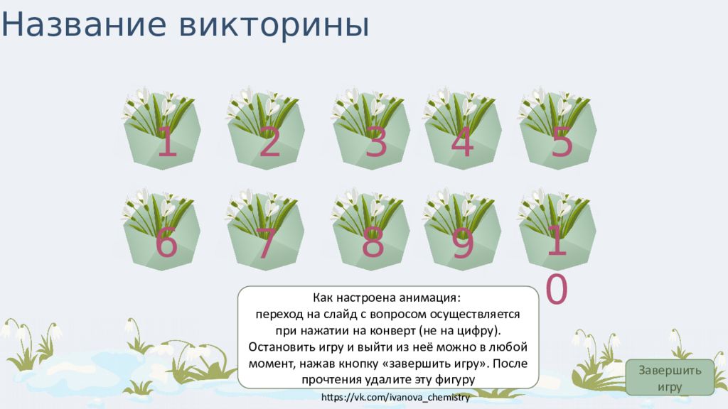 1 2 3 4 5 6 7 8 9 10 Название викторины Завершить игру Как настроена анимация: переход на слайд с вопросом осуществляется при нажатии на конверт (не на цифру). Остановить игру и выйти из неё можно в любой момент, нажав кнопку «завершить игру». После прочтения удалите эту фигуру