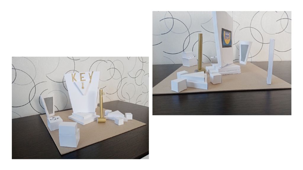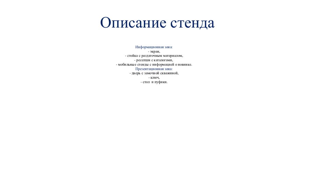 Информационная зона: - экран, - стойка с раздаточным материалом, - ресепшн с каталогами, - мобильные стенды с информацией о новинке. Презентационная зона: - дверь с замочной скважиной, - ключ, - стол и пуфики.