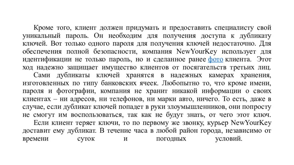 Слайд 3: Кроме того, клиент должен придумать и предоставить специалисту свой уникальный пароль. Он необходим для получения доступа к дубликату ключей. Вот только одного пароля для получения ключей недостаточно. Для обеспечения полной безопасности, компания NewYourKey использует для идентификации не только пароль, но и сделанное ранее фото клиента. Этот ход надежно защищает имущество клиентов от посягательств третьих лиц. Сами дубликаты ключей хранятся в надежных камерах хранения, изготовленных по типу банковских ячеек. Любопытно то, что кроме имени, пароля и фотографии, компания не хранит никакой информации о своих клиентах – ни адресов, ни телефонов, ни марки авто, ничего. То есть, даже в случае, если дубликат ключей попадет в руки злоумышленников, они попросту не смогут им воспользоваться, так как не будут знать, от чего этот ключ. Если клиент теряет ключи, то по первому же звонку, курьер NewYourKey доставит ему дубликат. В течение часа в любой район города, независимо от времени суток и погодных условий