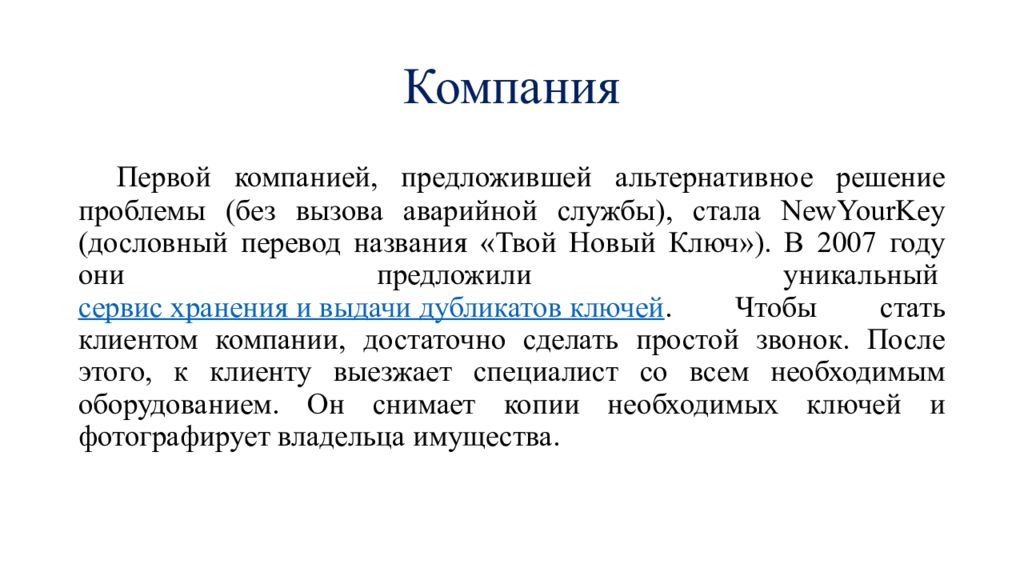 Первой компанией, предложившей альтернативное решение проблемы (без вызова аварийной службы), стала NewYourKey (дословный перевод названия «Твой Новый Ключ»). В 2007 году они предложили уникальный сервис хранения и выдачи дубликатов ключей. Чтобы стать клиентом компании, достаточно сделать простой звонок. После этого, к клиенту выезжает специалист со всем необходимым оборудованием. Он снимает копии необходимых ключей и фотографирует владельца имущества.