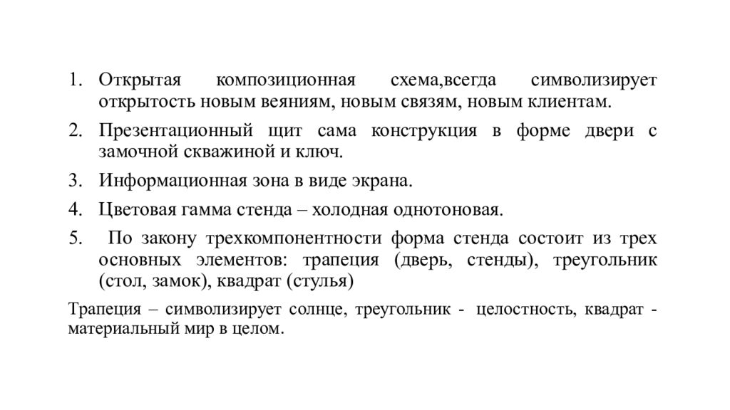 Открытая композиционная схема,всегда символизирует открытость новым веяниям, новым связям, новым клиентам. Презентационный щит сама конструкция в форме двери с замочной скважиной и ключ. Информационная зона в виде экрана. Цветовая гамма стенда – холодная однотоновая. По закону трехкомпонентности форма стенда состоит из трех основных элементов: трапеция (дверь, стенды), треугольник (стол, замок), квадрат (стулья) Трапеция – символизирует солнце, треугольник - целостность, квадрат - материальный мир в целом.