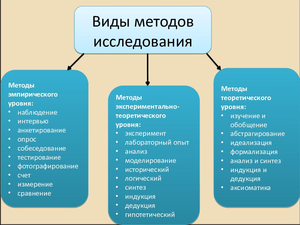 Виды методов исследования Методы эмпирического уровня: наблюдение интервью анкетирование опрос собеседование тестирование фотографирование счет измерение сравнение Методы экспериментально-теоретического уровня: эксперимент лабораторный опыт анализ моделирование исторический логический синтез индукция дедукция гипотетический Методы теоретического уровня: изучение и обобщение абстрагирование идеализация формализация анализ и синтез индукция и дедукция аксиоматика