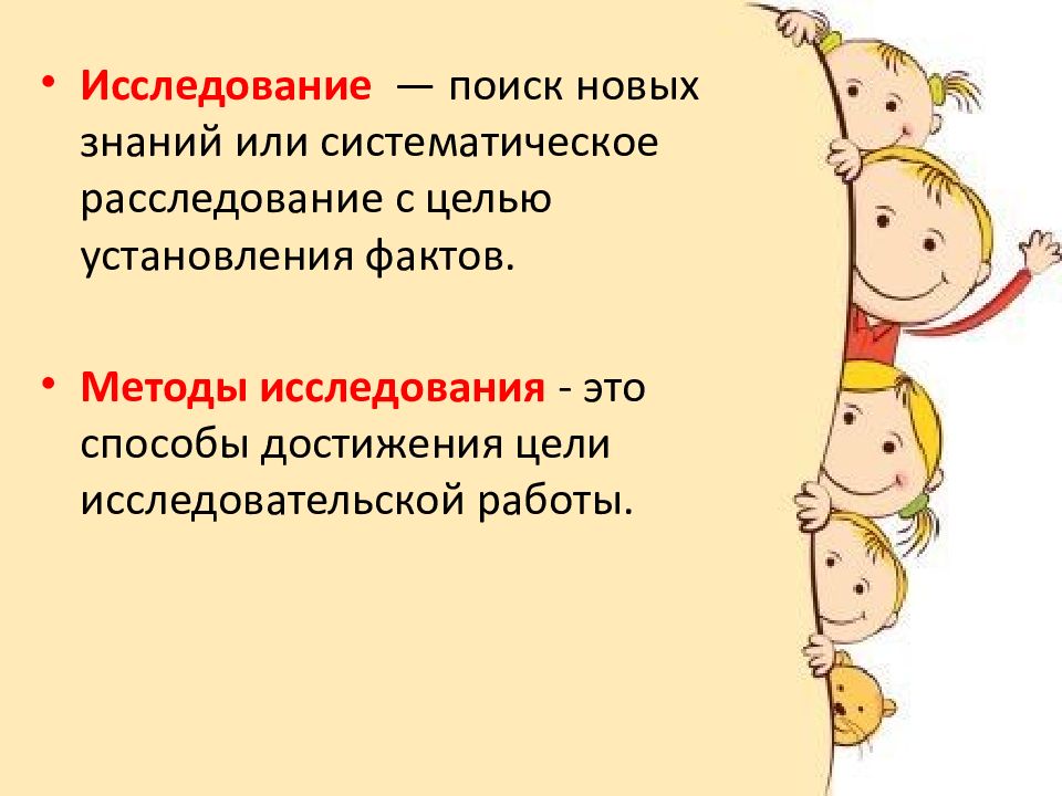 Исследование — поиск новых знаний или систематическое расследование с целью установления фактов. Методы исследования - это способы достижения цели исследовательской работы.