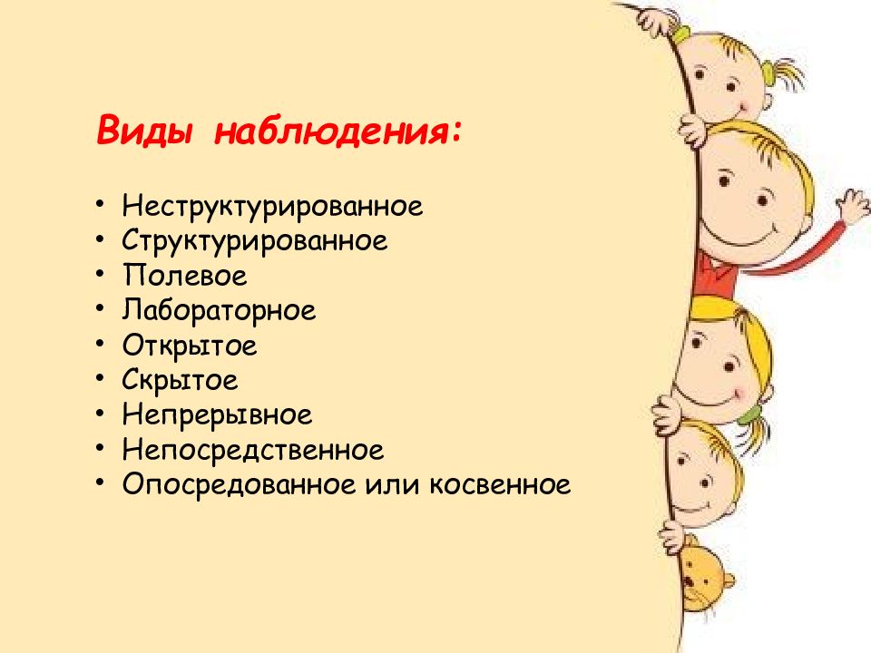 Виды наблюдения : Неструктурированное Структурированное Полевое Лабораторное Открытое Скрытое Непрерывное Непосредственное Опосредованное или косвенное