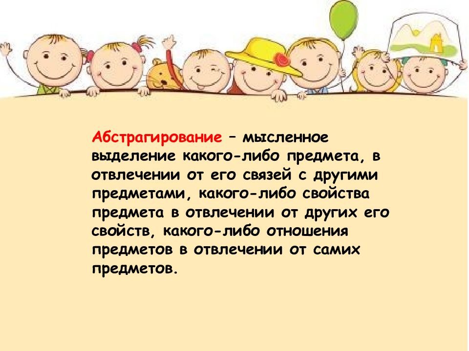 Абстрагирование – мысленное выделение какого-либо предмета, в отвлечении от его связей с другими предметами, какого-либо свойства предмета в отвлечении от других его свойств, какого-либо отношения предметов в отвлечении от самих предметов.