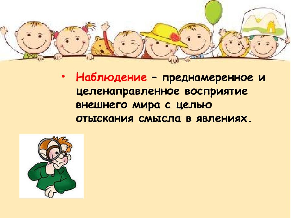 Наблюдение – преднамеренное и целенаправленное восприятие внешнего мира с целью отыскания смысла в явлениях.
