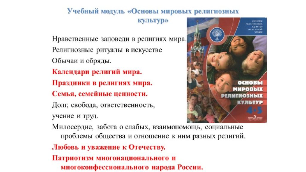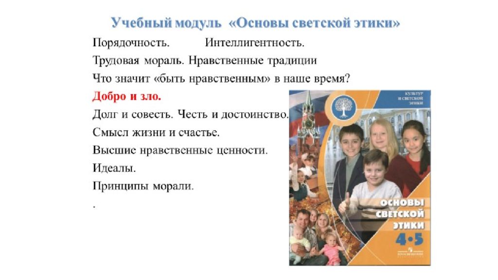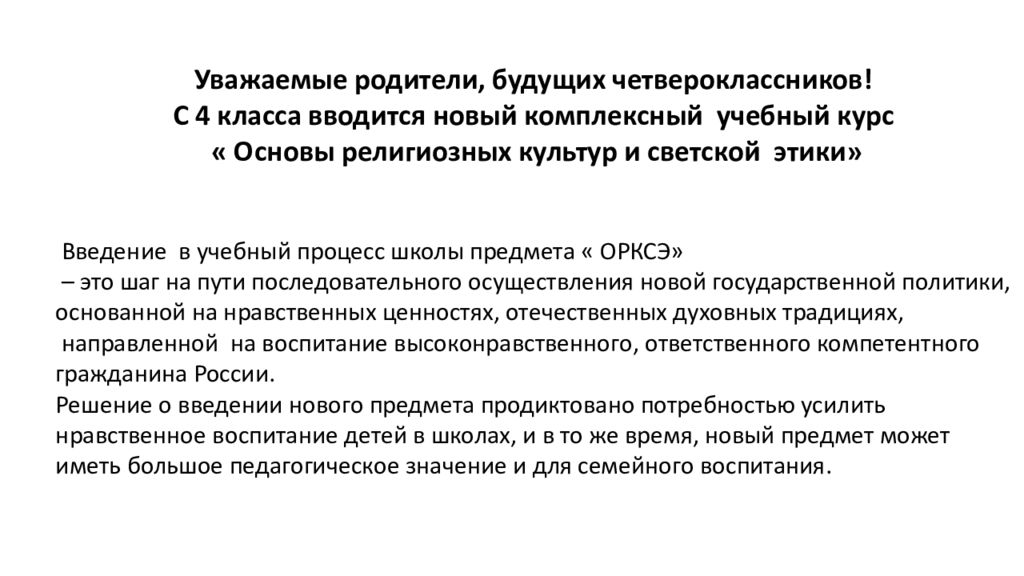 Уважаемые родители, будущих четвероклассников! С 4 класса вводится новый комплексный учебный курс « Основы религиозных культур и светской этики» Введение в учебный процесс школы предмета « ОРКСЭ» – это шаг на пути последовательного осуществления новой государственной политики, основанной на нравственных ценностях, отечественных духовных традициях, направленной на воспитание высоконравственного, ответственного компетентного гражданина России. Решение о введении нового предмета продиктовано потребностью усилить нравственное воспитание детей в школах, и в то же время, новый предмет может иметь большое педагогическое значение и для семейного воспитания.