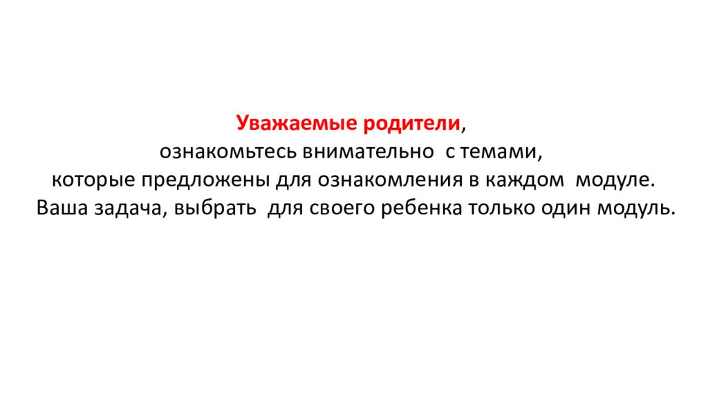 Уважаемые родители, ознакомьтесь внимательно с темами, которые предложены для ознакомления в каждом модуле. Ваша задача, выбрать для своего ребенка только один модуль.