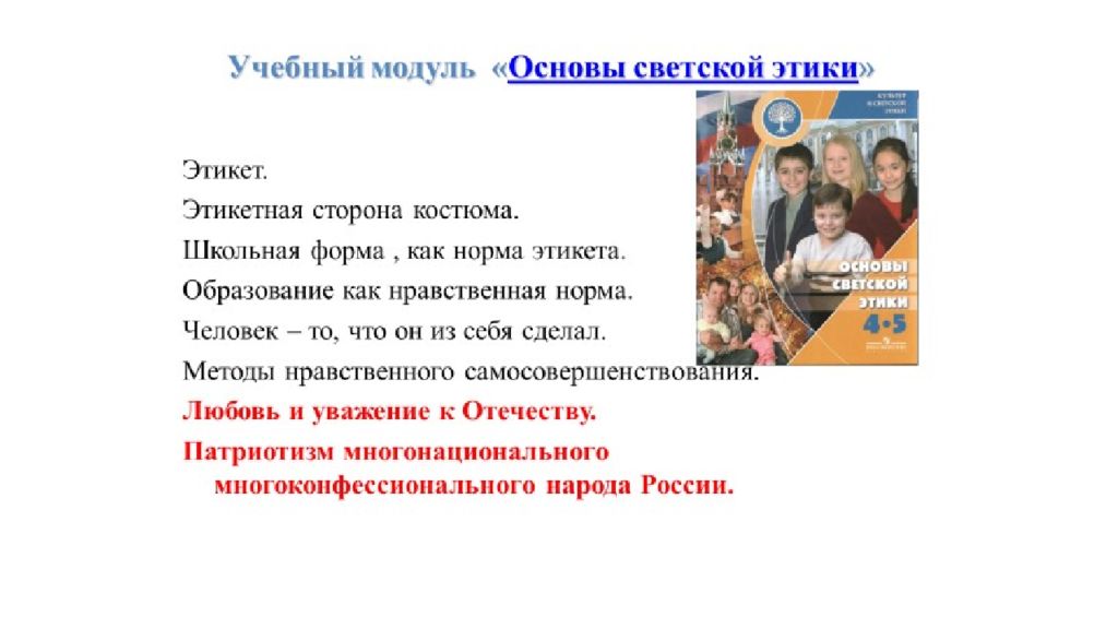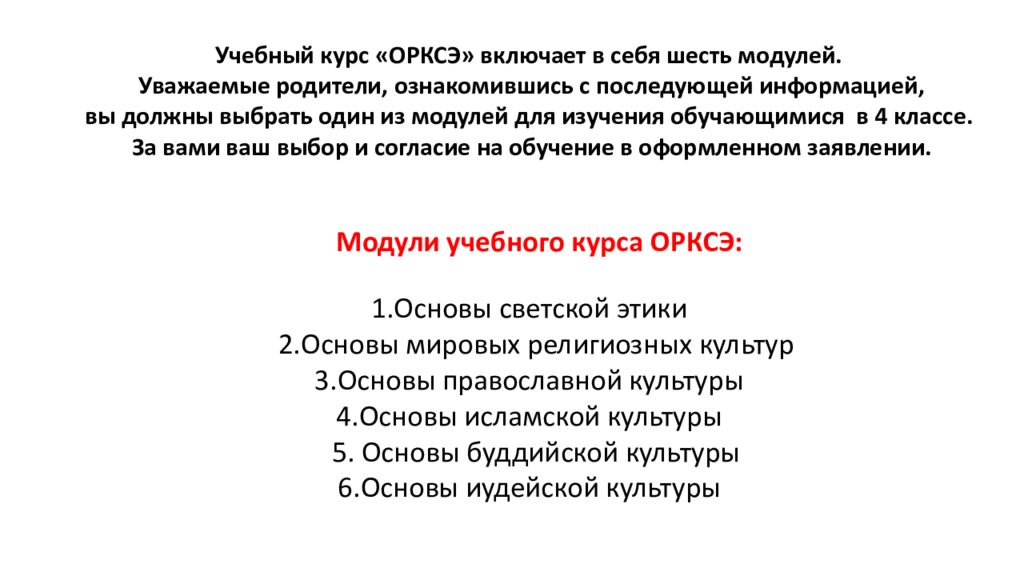 Учебный курс «ОРКСЭ» включает в себя шесть модулей. Уважаемые родители, ознакомившись с последующей информацией, вы должны выбрать один из модулей для изучения обучающимися в 4 классе. За вами ваш выбор и согласие на обучение в оформленном заявлении. Модули учебного курса ОРКСЭ: 1.Основы светской этики 2.Основы мировых религиозных культур 3.Основы православной культуры 4.Основы исламской культуры 5. Основы буддийской культуры 6.Основы иудейской культуры