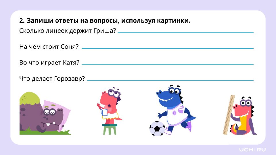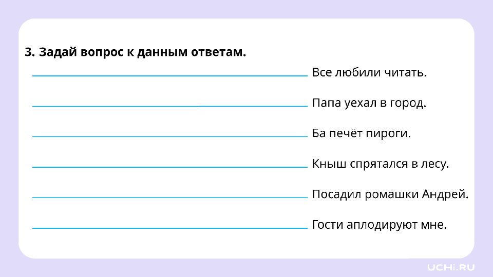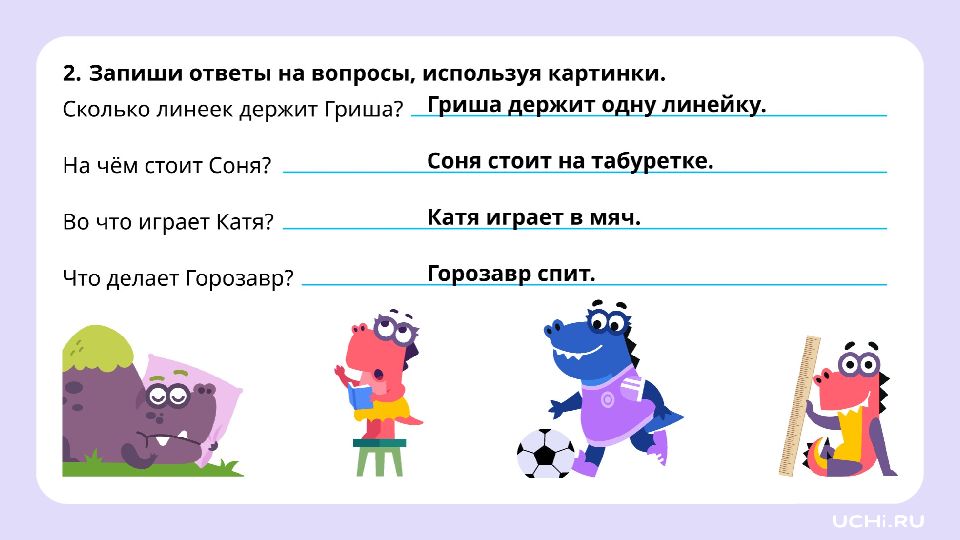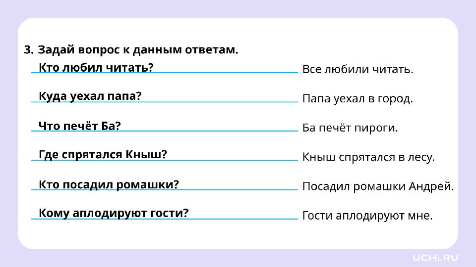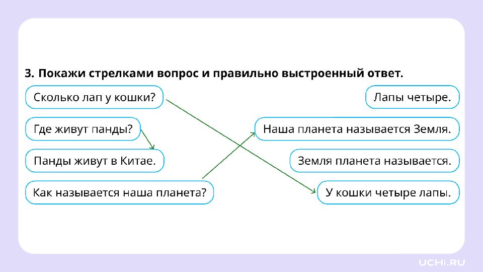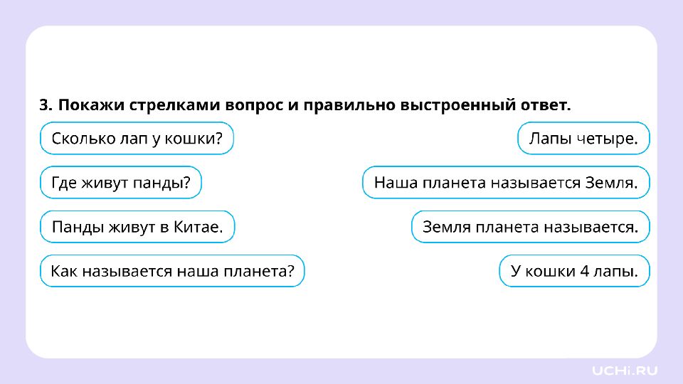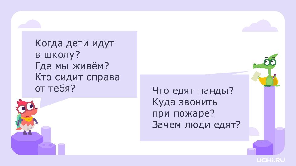 Когда дети идут в школу? Где мы живём? Кто сидит справа от тебя? Что едят панды? Куда звонить при пожаре? Зачем люди едят?