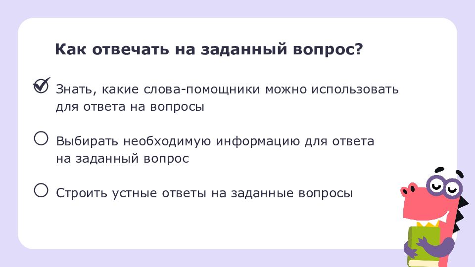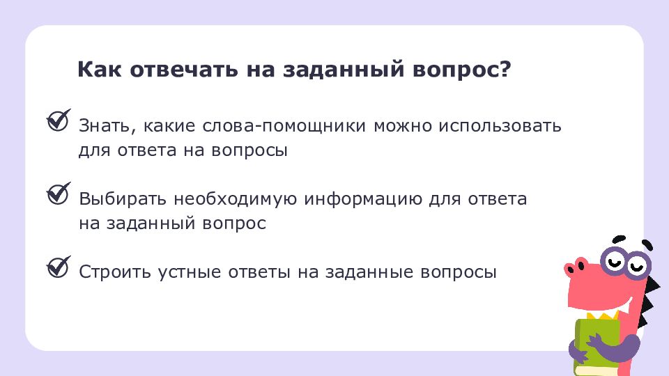 Как отвечать на заданный вопрос? Знать, какие слова-помощники можно использовать для ответа на вопросы Выбирать необходимую информацию для ответа на заданный вопрос Строить устные ответы на заданные вопросы