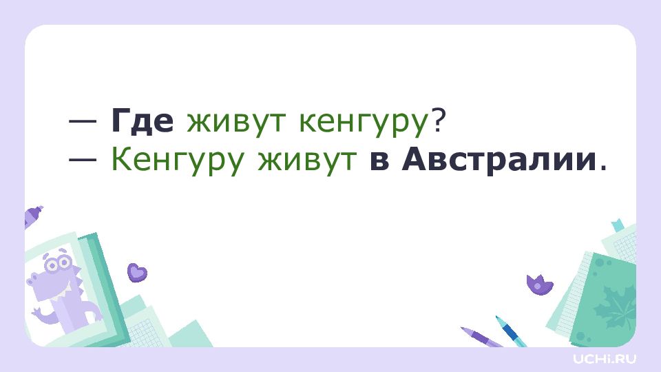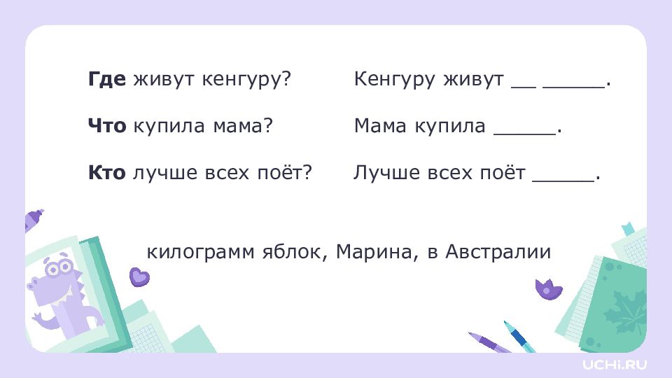 Где живут кенгуру? Что купила мама? Кто лучше всех поёт? Кенгуру живут __ _________. Мама купила ______________. Лучше всех поёт___________. Где живут кенгуру? Что купила мама? Кто лучше всех поёт? Кенгуру живут __ _____. Мама купила _____. Лучше всех поёт _____. килограмм яблок, Марина, в Австралии