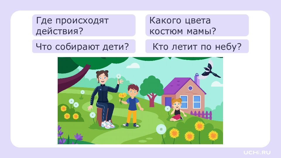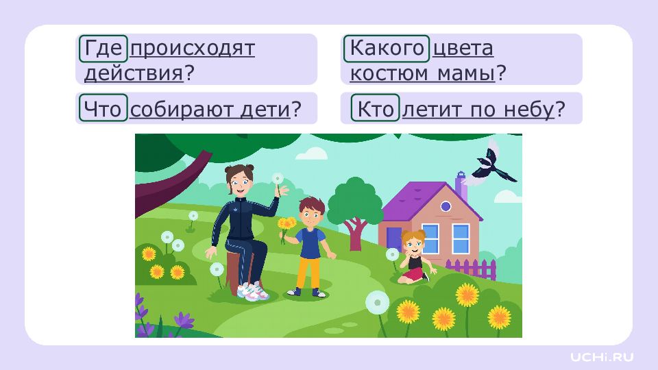 Где происходят действия ? Какого цвета костюм мамы ? Что собирают дети ? Кто летит по небу ? Действия происходят в саду. Дети собирают цветы. По небу летит птица. Костюм мамы синего цвета.