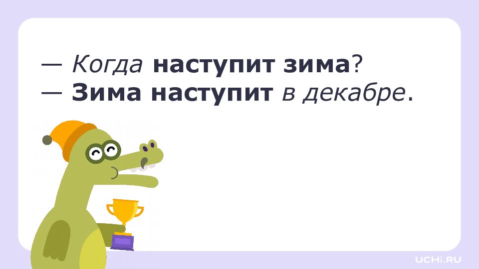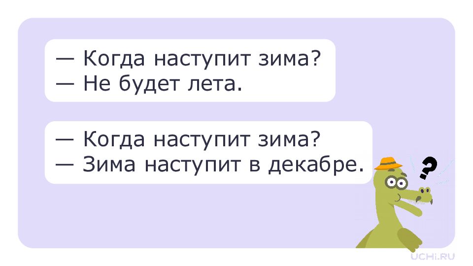 — Когда наступит зима? — Зима наступит в декабре. — Когда наступит зима? — Не будет лета.