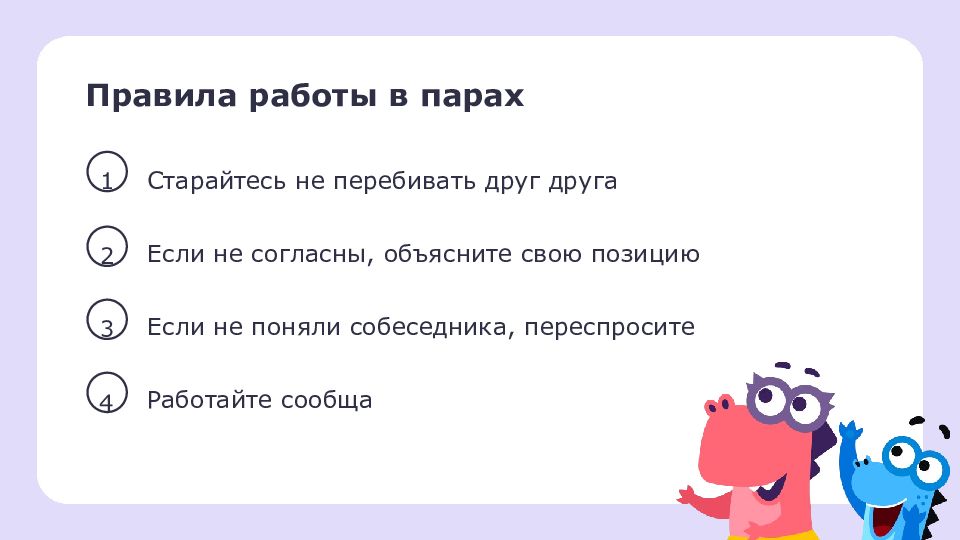Правила работы в парах 1 2 Если не согласны, объясните свою позицию 3 Если не поняли собеседника, переспросите 4 Работайте сообща Старайтесь не перебивать друг друга