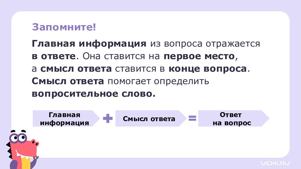 Запомните! Главная информация из вопроса отражается в ответе. Она ставится на первое место, а смысл ответа ставится в конце вопроса. Смысл ответа помогает определить вопросительное слово. Главная информация Смысл ответа Ответ на вопрос
