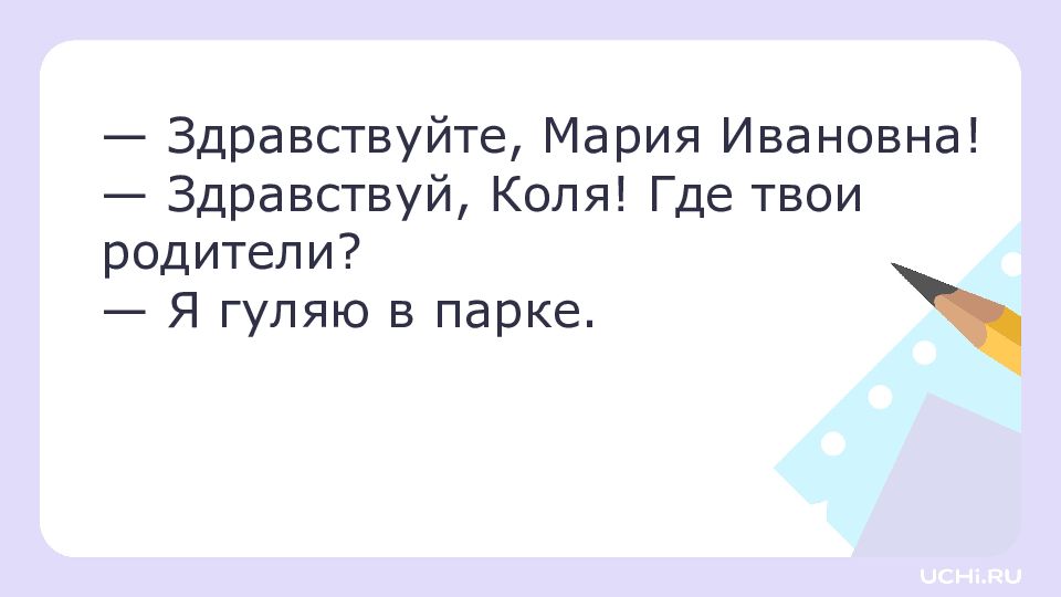 — Здравствуйте, Мария Ивановна! — Здравствуй, Коля! Где твои родители? — Я гуляю в парке.