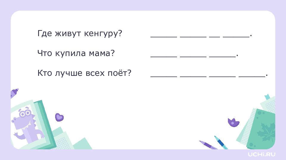 Где живут кенгуру? Что купила мама? Кто лучше всех поёт? _____ _____ __ _____. _____ _____ _____. _____ _____ _____ _____.