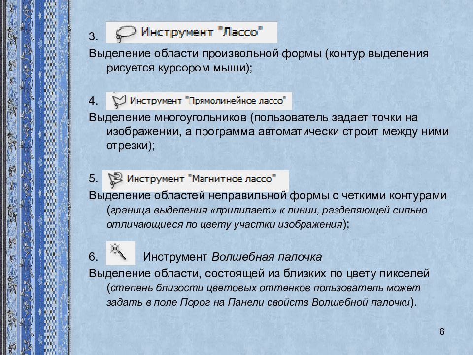 3. Выделение области произвольной формы (контур выделения рисуется курсором мыши); 4. Выделение многоугольников (пользователь задает точки на изображении, а программа автоматически строит между ними отрезки); 5. Выделение областей неправильной формы с четкими контурами ( граница выделения «прилипает» к линии, разделяющей сильно отличающиеся по цвету участки изображения ); Инструмент Волшебная палочка Выделение области, состоящей из близких по цвету пикселей ( степень близости цветовых оттенков пользователь может задать в поле Порог на Панели свойств Волшебной палочки ). 6