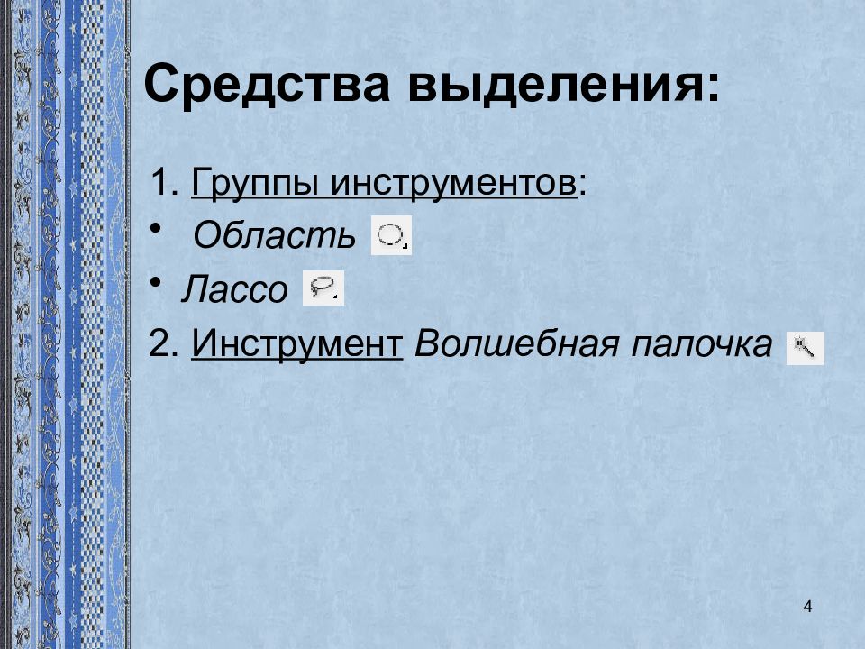 1. Группы инструментов : Область Лассо 2. Инструмент Волшебная палочка 4