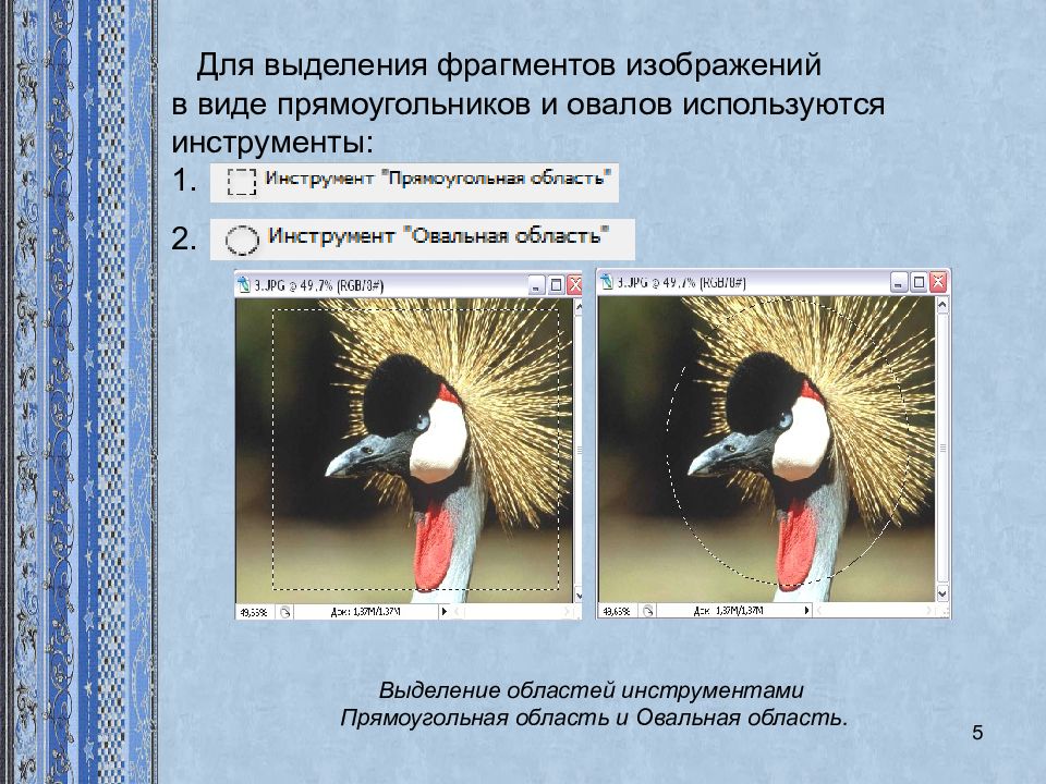 Для выделения фрагментов изображений в виде прямоугольников и овалов используются инструменты: 1. 2. Выделение областей инструментами Прямоугольная область и Овальная область. 5