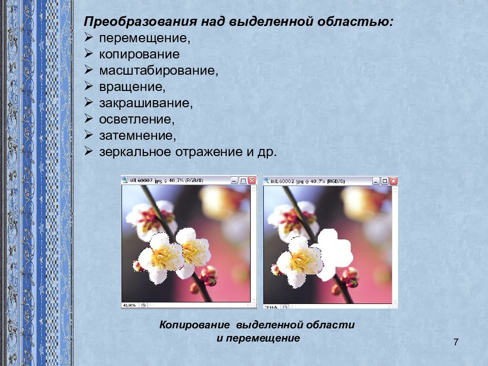 Преобразования над выделенной областью: перемещение, копирование масштабирование, вращение, закрашивание, осветление, затемнение, зеркальное отражение и др. Копирование выделенной области и перемещение 7